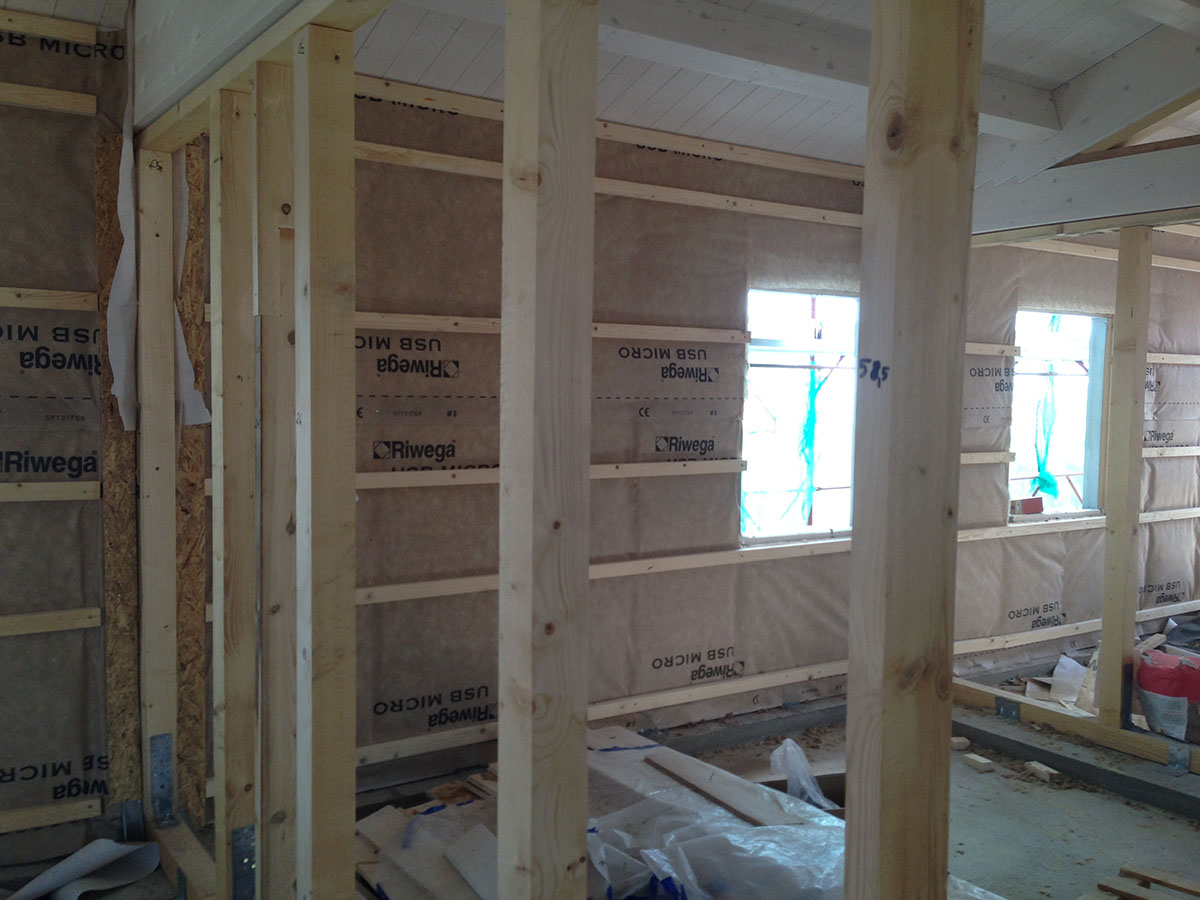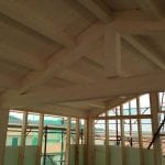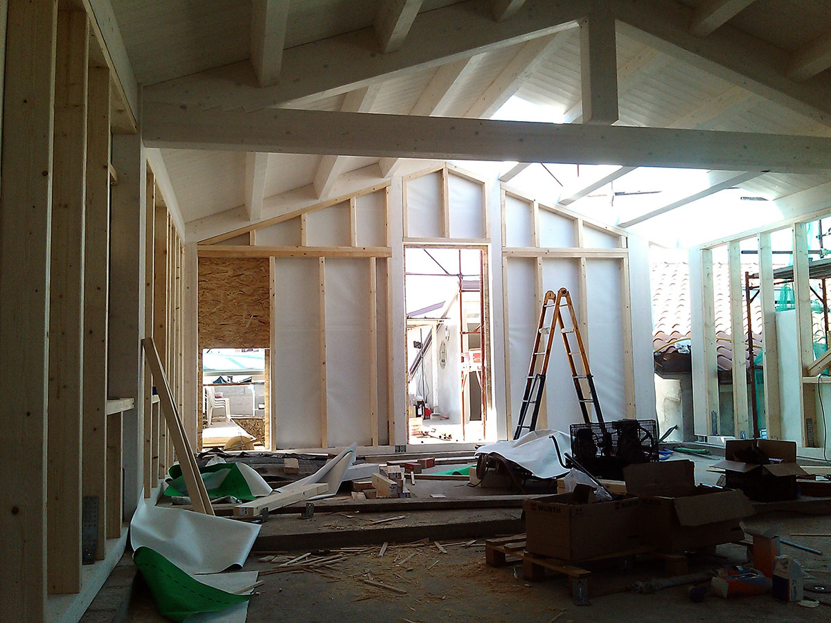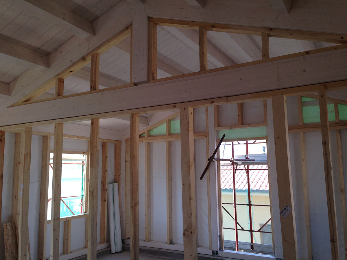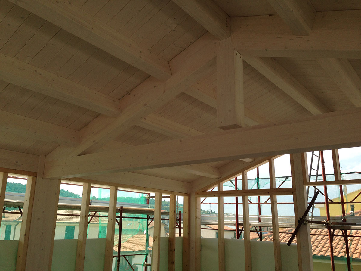 Le opere in progetto hanno riguardato la demolizione di solai di copertura in latero-cemento, la ricostruzione di un nuovo solaio con struttura in legno lamellare nella parte Sud e nella realizzazione della sopraelevazione con una struttura in legno con sistema del tipo a telaio “platform frame” e copertura con travi in legno lamellare.